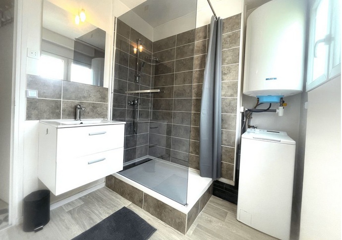 Il se compose d'un séjour, d'une kitchenette équipée(plaque, four micro-onde, hotte), une salle d'eau avec machine à laver, un WC et une chambre.